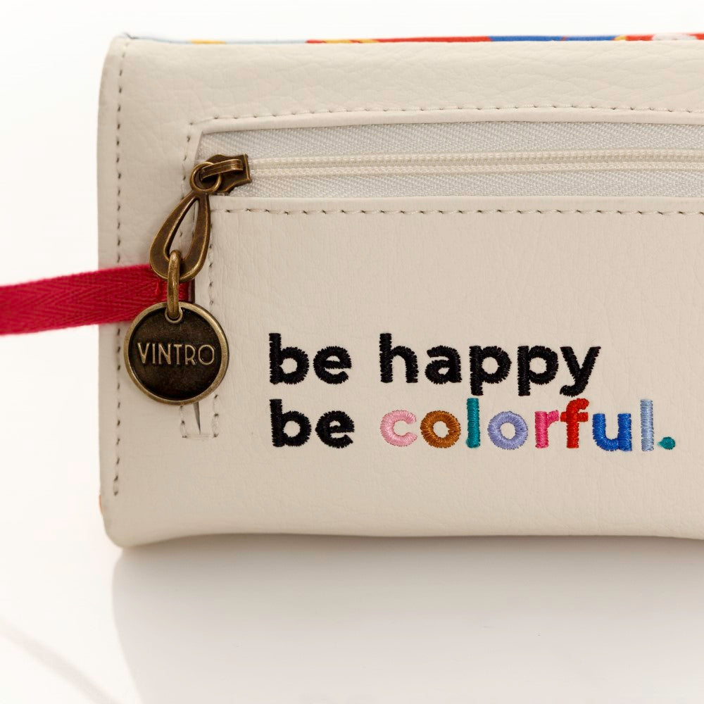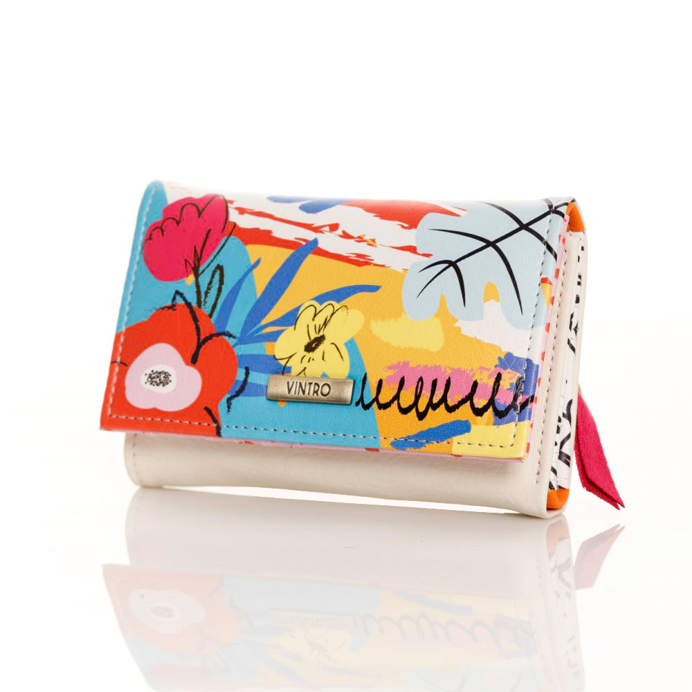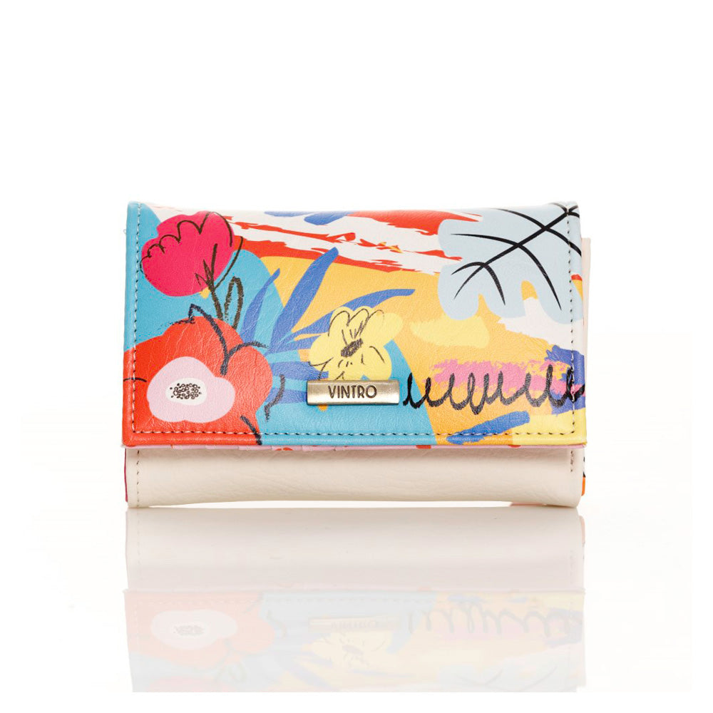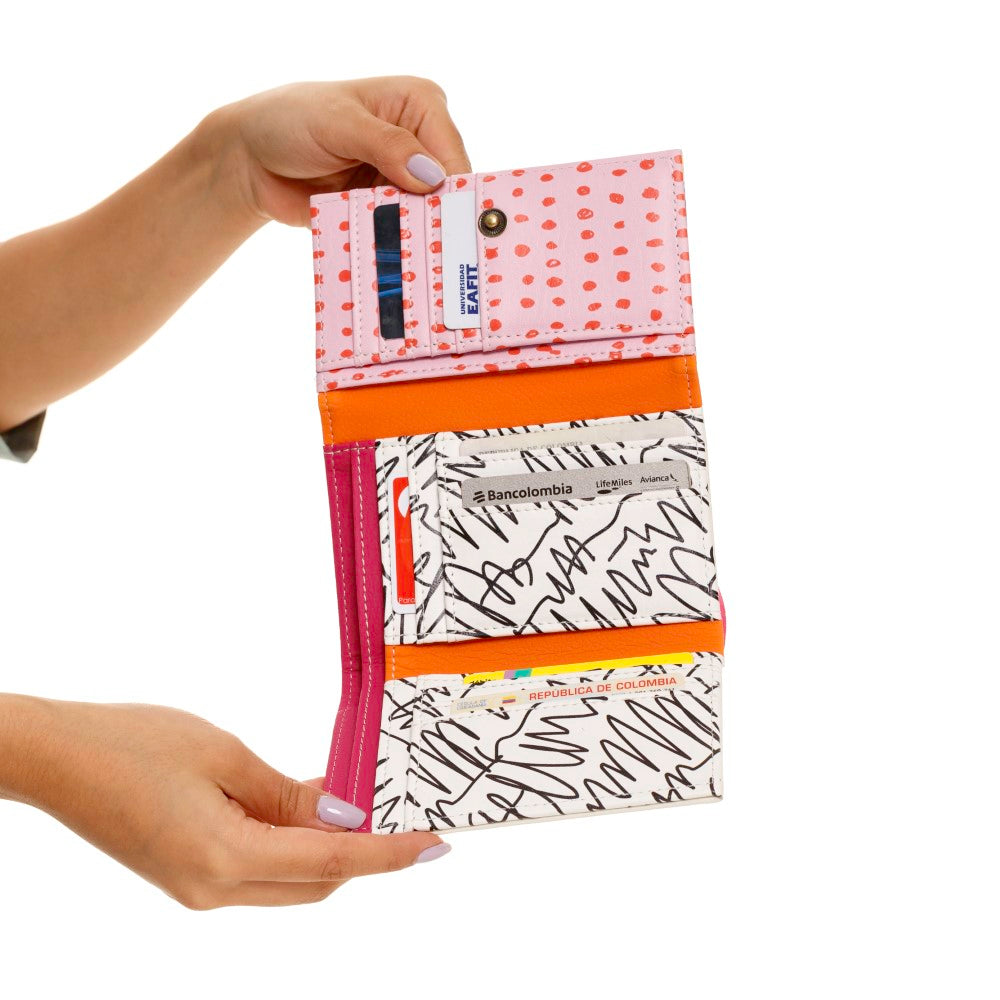 Billetera mediana estampada en la parte frontal y posterior en la colección Im Art, bolsillo externo en la parte posterior. Interior con compartimientos en cuero vegano estampado, exterior en cuero vegano 100% Colombiano.