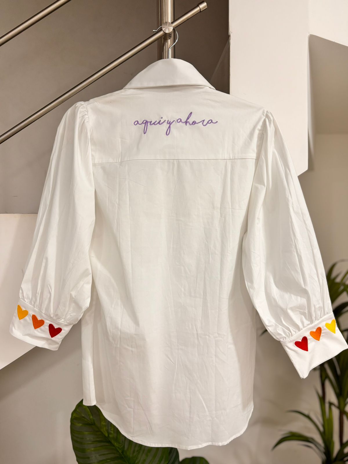 Camisa 100% colombiana, bordada con corazones de colores en los puños de las mangas.