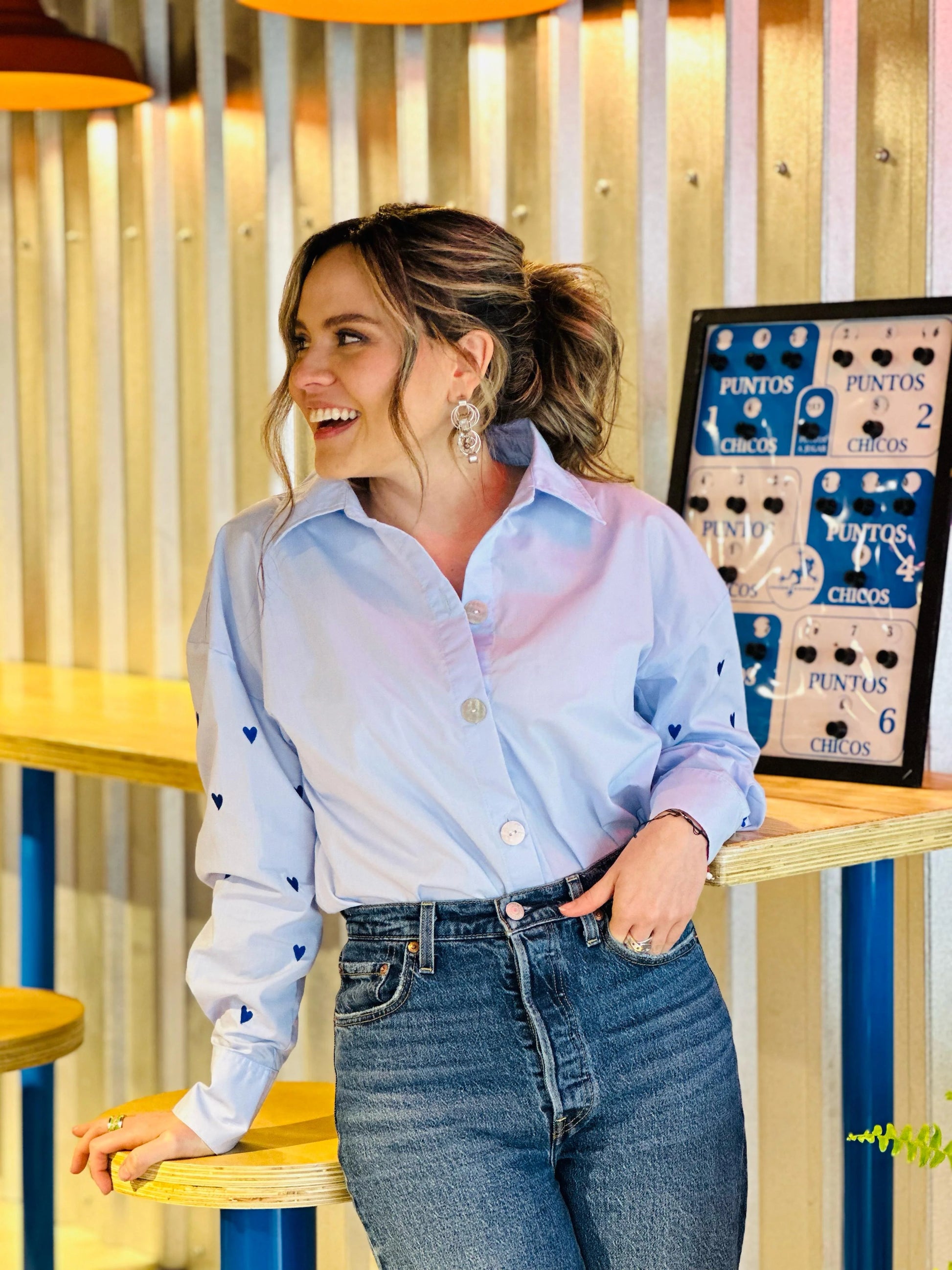Camisa bordada con abertura de botones en la parte trasera y corazones en las mangas.