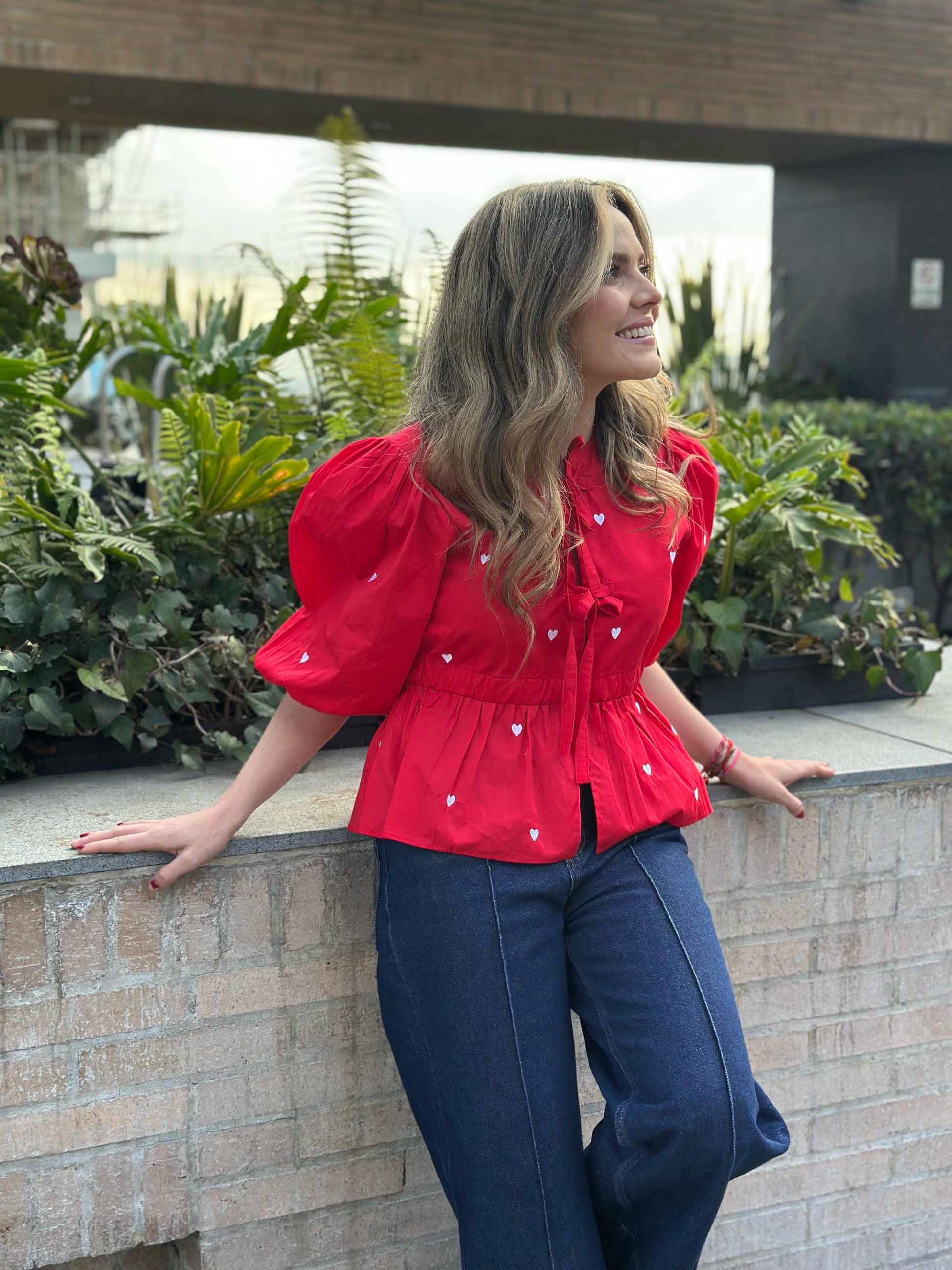 Camisa con corazones bordados dorados con un ligero ajuste en la cintura y amarre con lazo de la misma tela de la camisa.