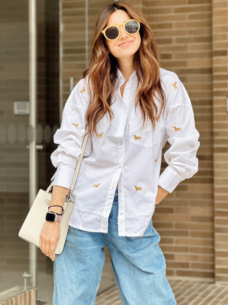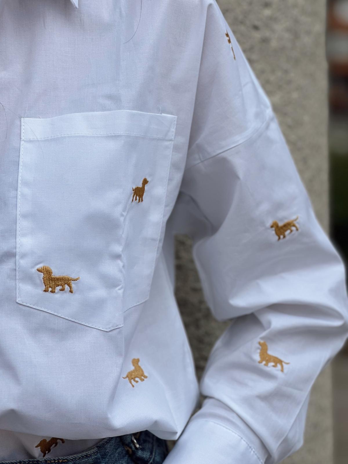Camisa, bordada en toda la parte delantera con perros, salchicha dorados.
