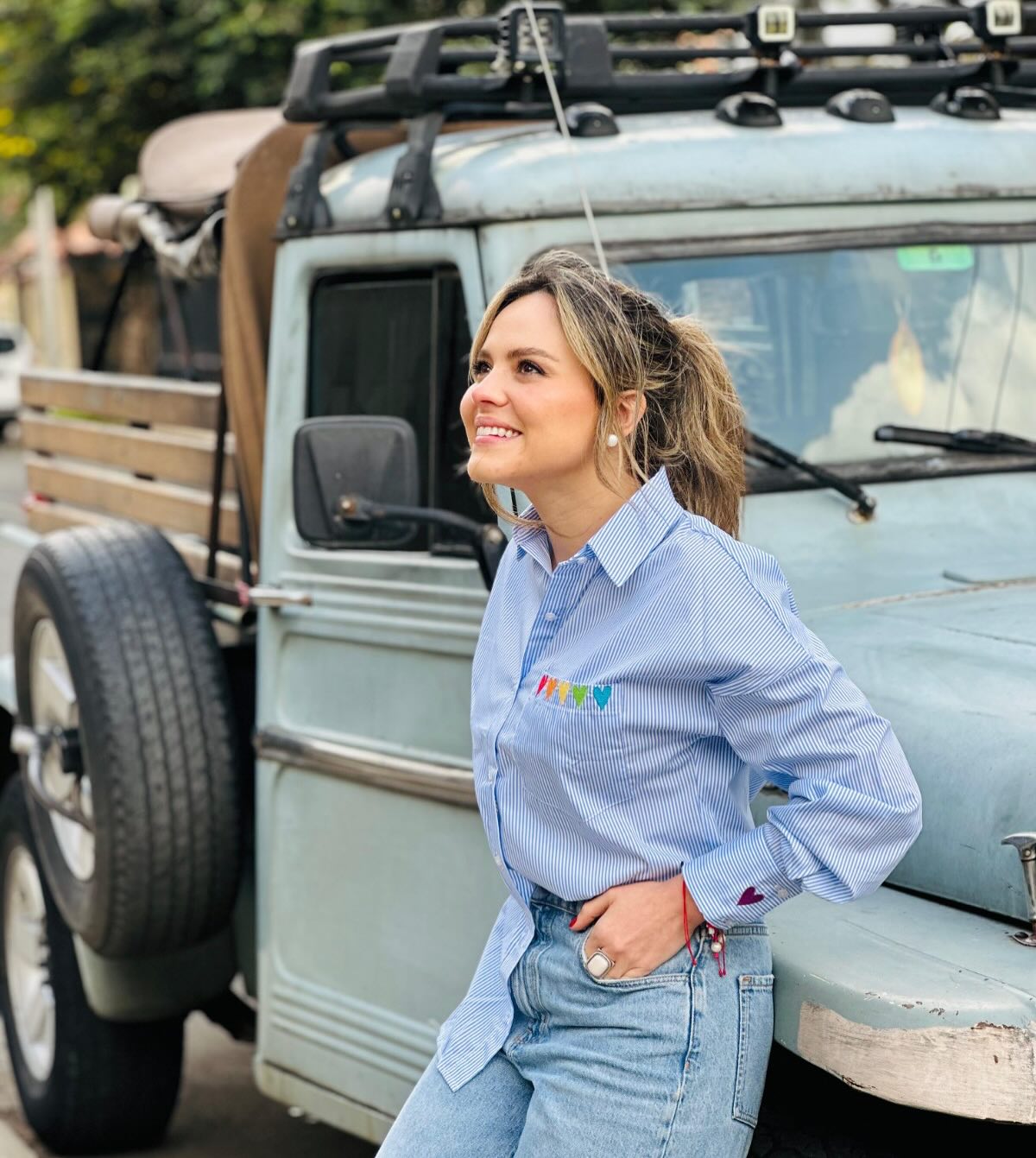 Camisa 100% colombiana, bordada con corazones de colores y bolsillo en los puños de las mangas.